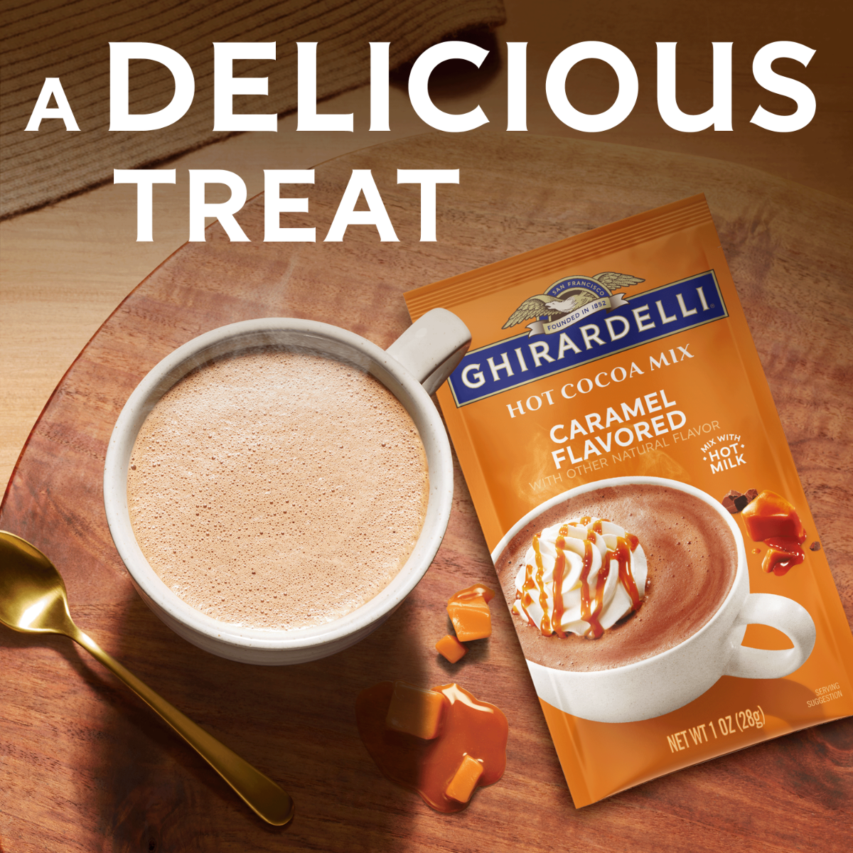 - Includes 64 single-serve 1 oz packets of GHIRARDELLI Caramel Flavored Hot Cocoa Mix (Case of 8 cartons)