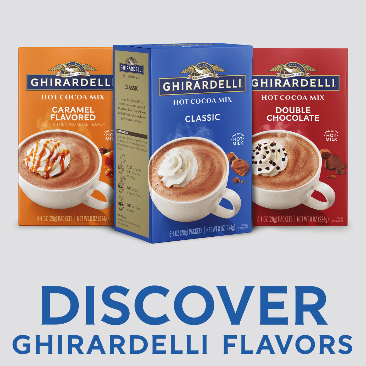 Includes 64 single-serve 1 oz packets of GHIRARDELLI Classic Hot Cocoa Mix (Case of 8 cartons)