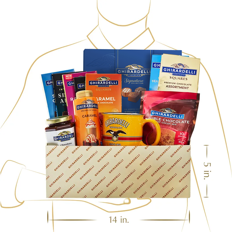 Make the grandest of gestures with the Ghirardelli Grand Assortment Chocolate Gift Box. Beautifully packaged in our gold box with a gold bow, this gift box features a huge selection of all our favorite products and flavors. From our tangy Raspberry Dark Chocolate Bar to our indulgent Chocolate Fudge Sauce and Signature Chocolate Pralines. Each premium piece is sure to delight the lucky recipient of this delightful chocolate gift box.