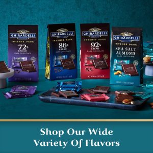 Enjoy a decadent experience with GHIRARDELLI Intense Dark Sea Salt Almond Dark Chocolate Bars. This case of 12 dark chocolate bars is crafted with high-quality cocoa beans and skillfully blended with roasted almonds and sea salt for an irresistible combination of salty and sweet. Each intensely delicious square caters to your senses and perfect for after dinner treat!